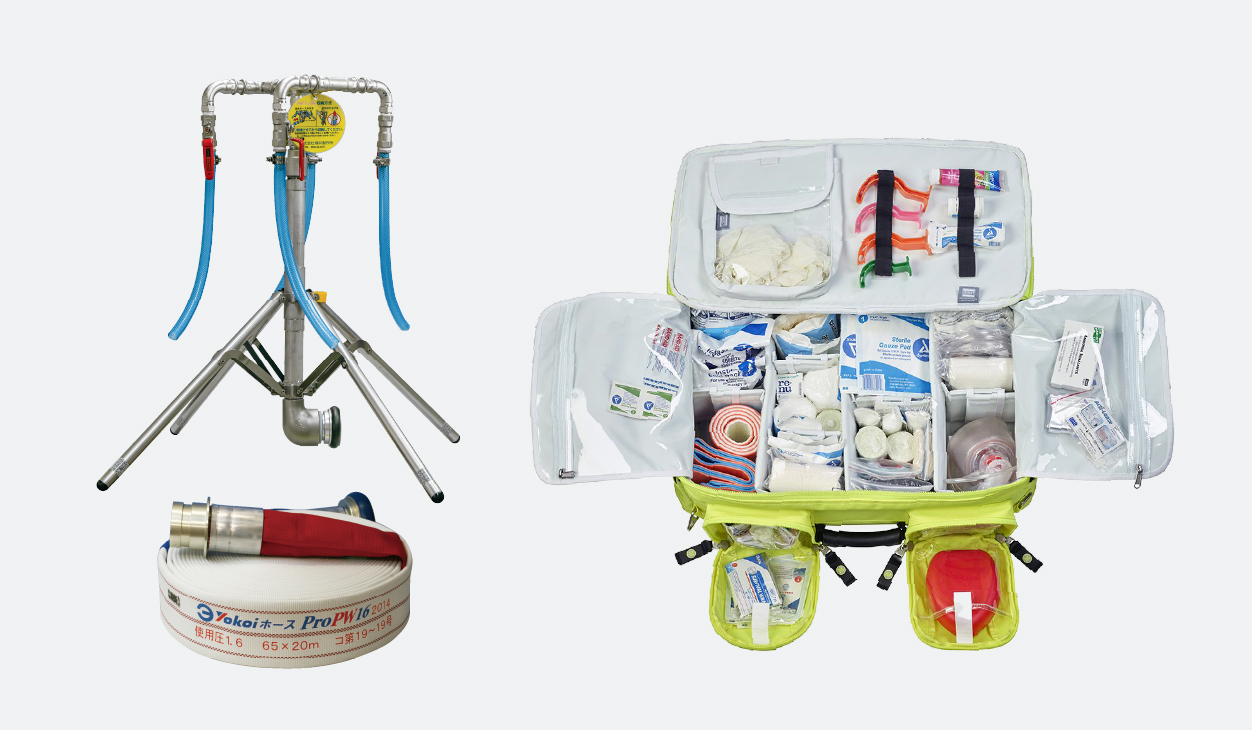 消防ホース、放水器具、消防車の艤装・積載用品、救護バッグ(メディカルバッグ、トレーナーバッグ)などの消防・救護必需品をはじめ、非常時用食料や飲料水などの防災資機材・防災倉庫用品まで幅広く取り扱っています。