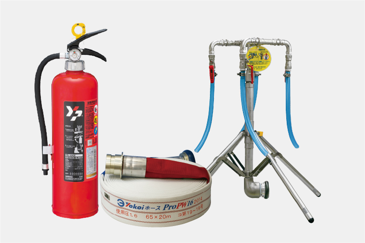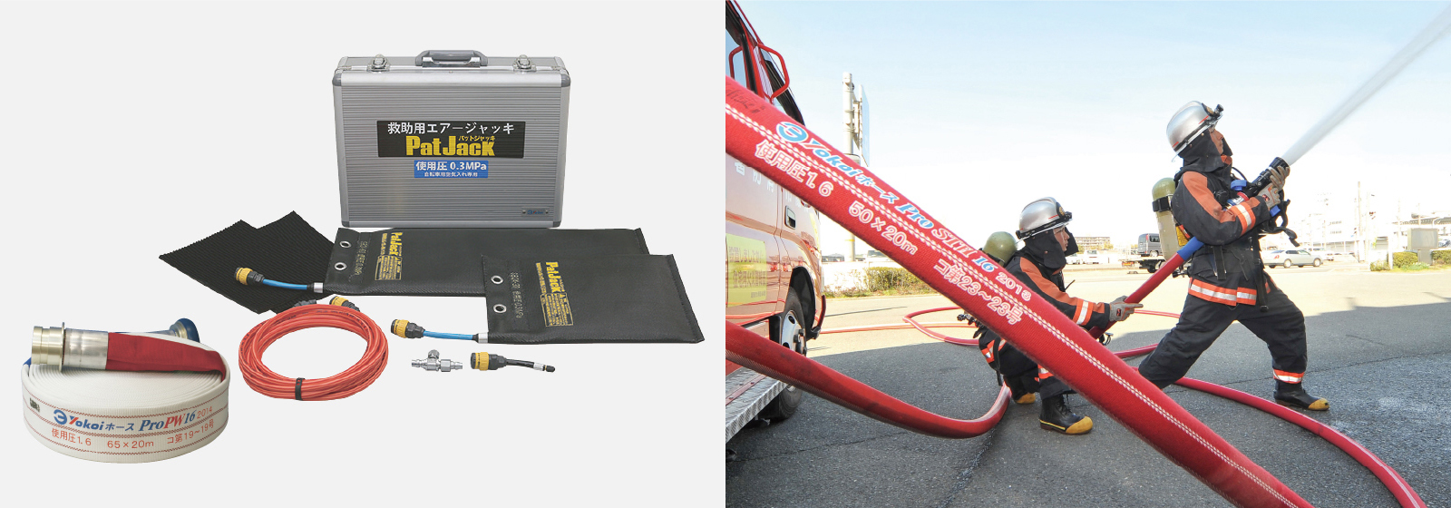 商品として、消防ホース、放水器具、消火栓、消防車の艤装・積載用品、救助器具、救急用品、救急バッグ、避難器具など消防・救助・救急必需品を網羅し、さらに非常時用食料や飲料水などの防災資機材まで取り扱っております。